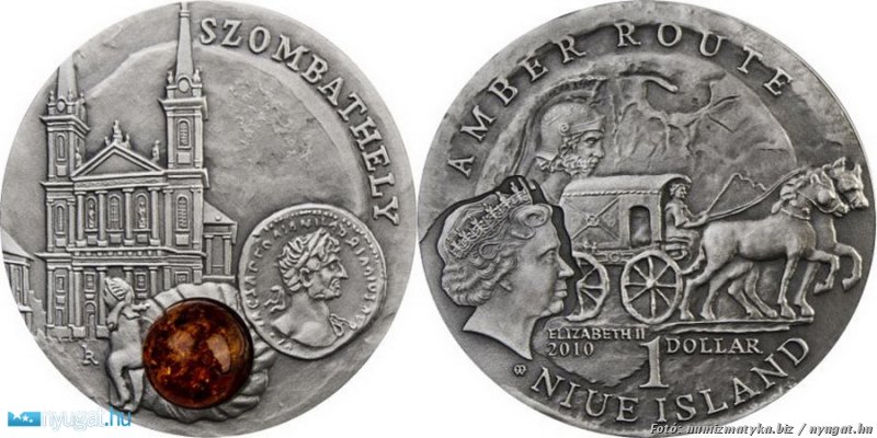 Niue Island egy kis sziget anglia fenhatósága alatt. A sziget részben önálló, de kormányzásilag erősen függő. Lakossága nagyrészt polinéz. Még két éve kezdtek speciális érmék kibocsájtásába, amikkel a Borostyánkő útnak és a melette lévő egykor fontos városoknak állít emléket így Szombathelynek is. Az érmékkel az alábbi városokat örökítik meg.: Kalinyingrád, Gdańsk, Elbl±g, Wrocław, Stare Hradisko, Szombathely, Carnuntum, Aquileia.